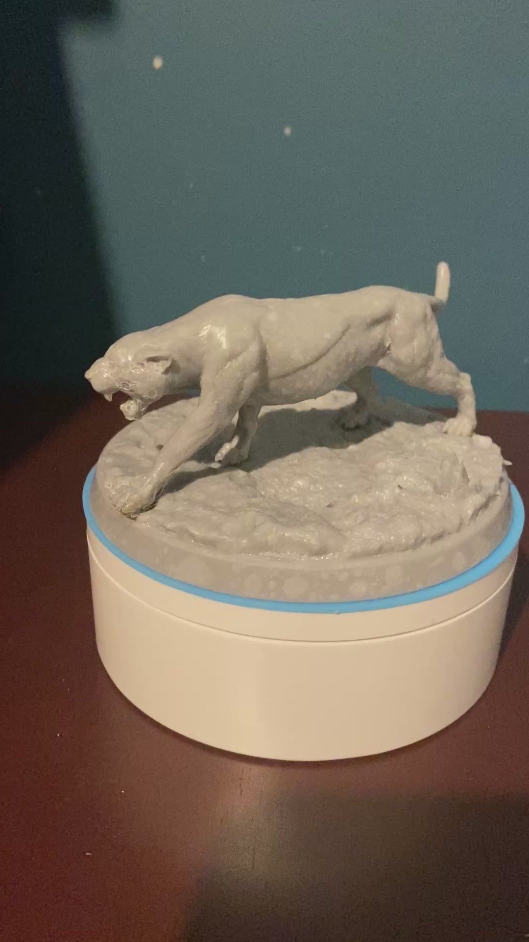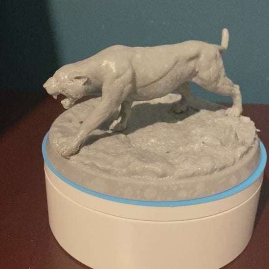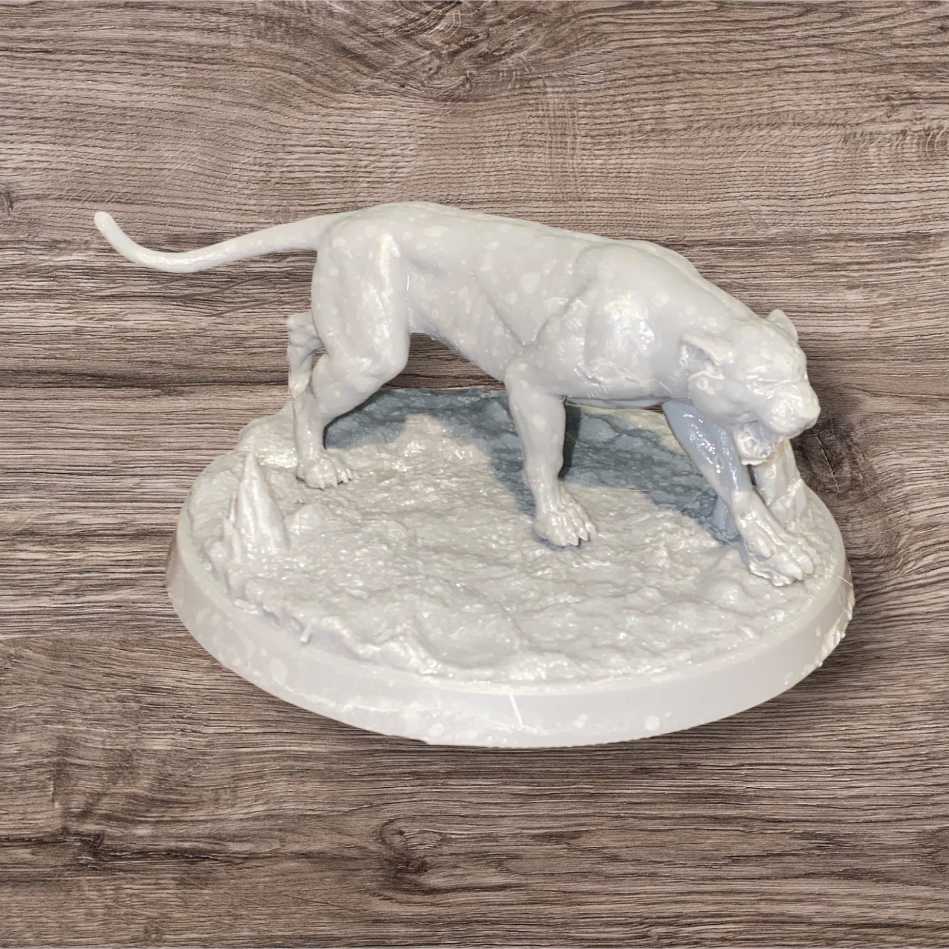 Paws was designed by STLFlix and is ready to paint. His base is 4.5 inches in diameter. He is 5 inches long and 1 inch wide.