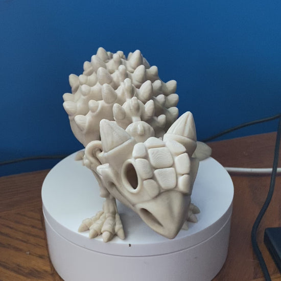We are excited to present the Skeleton Ankylosaurus, a delightful and fully articulated collectible that showcases both cuteness and flexibility. Designed by the talented team at Flexi Factory, this charming piece measures 3.5 inches tall, 2.5 inches wide, and 10 inches in length, making it a perfect gift for any dinosaur enthusiast. The Ankylosaurus comes with an optional 5.5-inch stand available in elegant black or warm brown. Additionally, you have the opportunity to choose the color of the Ankylosaurus itself.