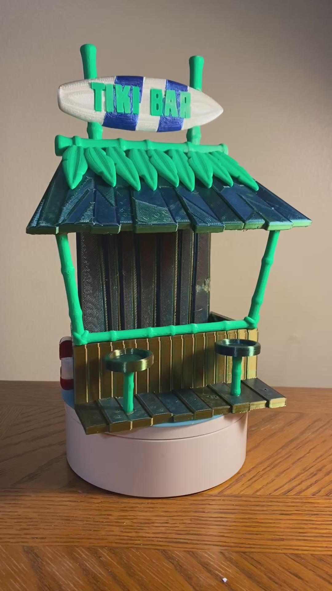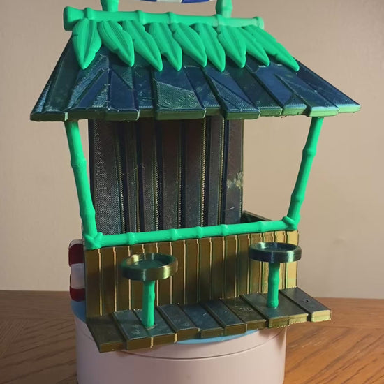 This adorable Tiki Bar Bird Feeder was designed by STLFlix as part of their Tweet Retreats collection. It is 5 inches wide, 3.5 inches long and 8.5 inches high. It comes with a bottom mount.